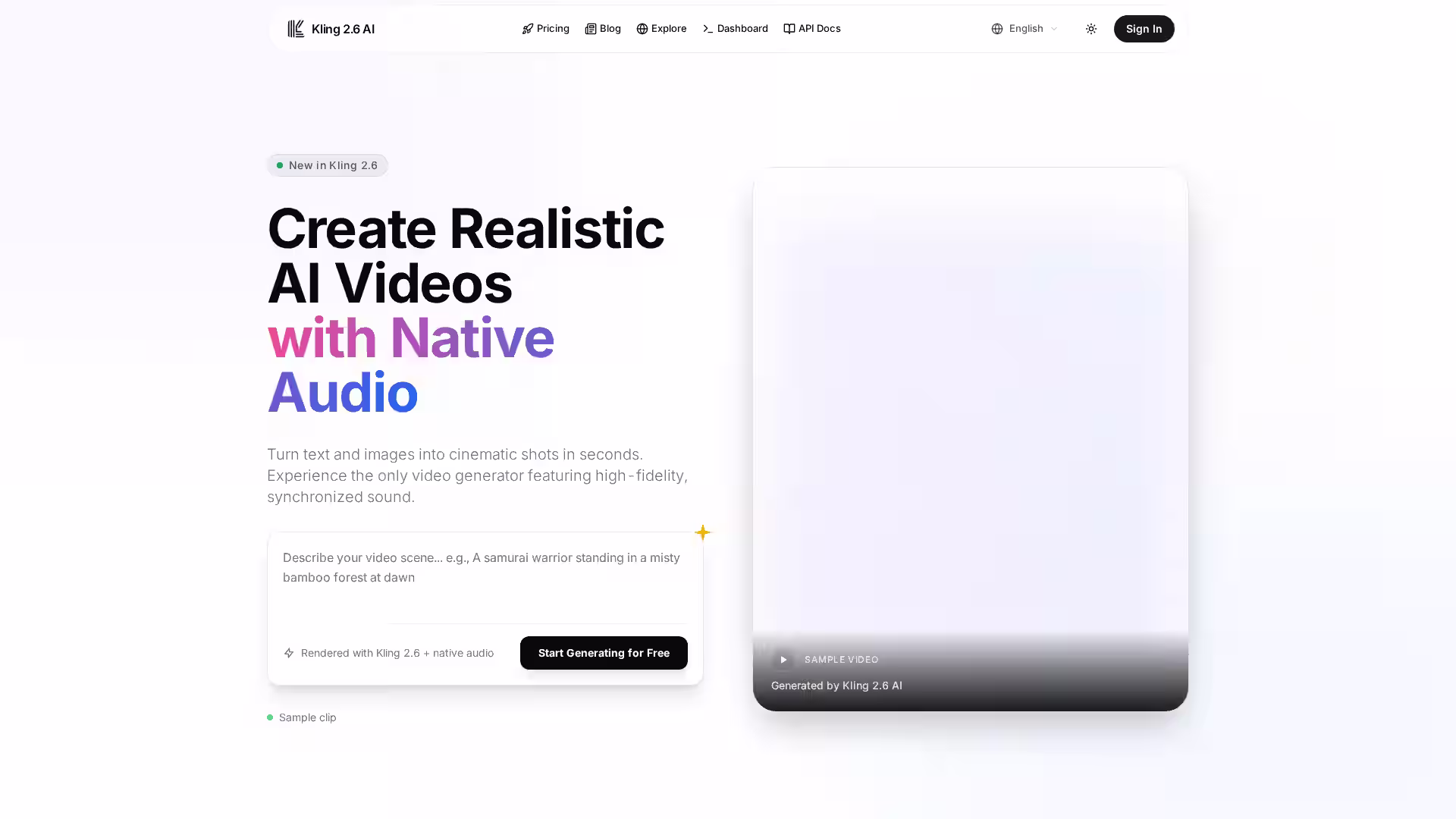Kling 2.6 AI is a state-of-the-art AI video generator that produces photorealistic videos from text and images, uniquely featuring native audio that is synthesized and synchronized during generation.