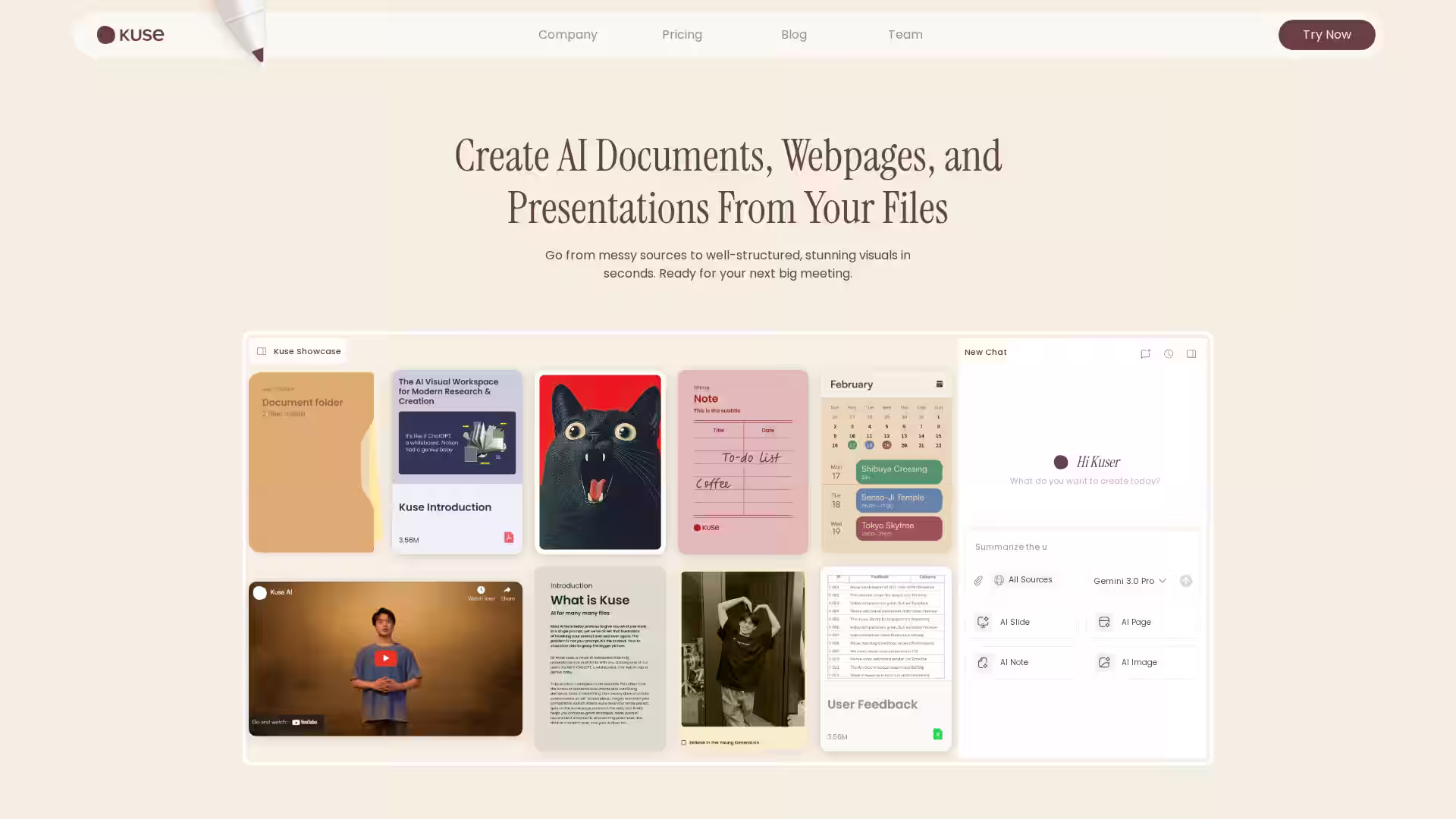 Kuse is an advanced AI-powered content creation platform that transforms your raw materials — documents, slides, spreadsheets, images, and more — into polished, structured outputs in seconds. Designed to work directly with your own data, Kuse simplifies the process of creating professional-quality documents, webpages, and presentations by leveraging cutting-edge AI models. Whether you are preparing for a big meeting, designing educational materials, or producing marketing assets, Kuse gives you the tools to turn messy and unstructured sources into organized, actionable content.