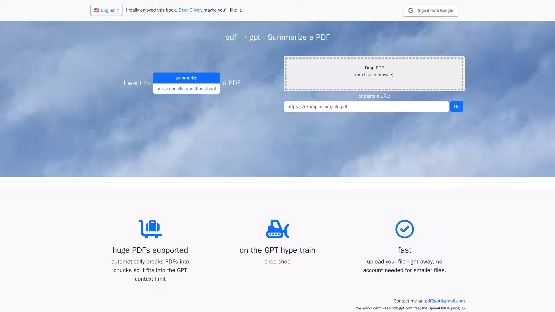 Summarize large PDF documents quickly and easily using advanced GPT-powered AI summaries.