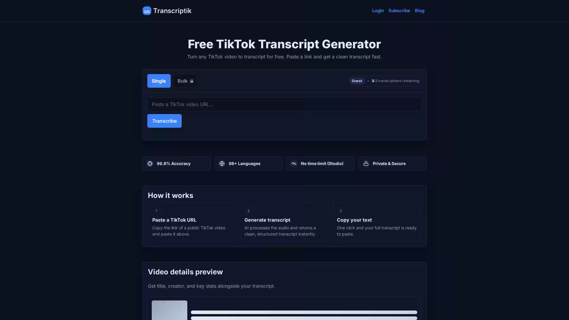 No account is needed to try it out—simply paste a TikTok video link and get a free transcription instantly.